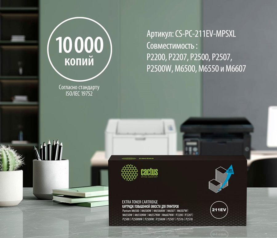 Компания CACTUS представляет вашему вниманию обновлённую версию популярного картриджа CS-PC-211EV — модель CS-PC-211EV-MPSXL. Теперь вы можете печатать до 10 000 страниц c гарантией качества и абсолютной совместимостью с широким рядом моделей Pantum!